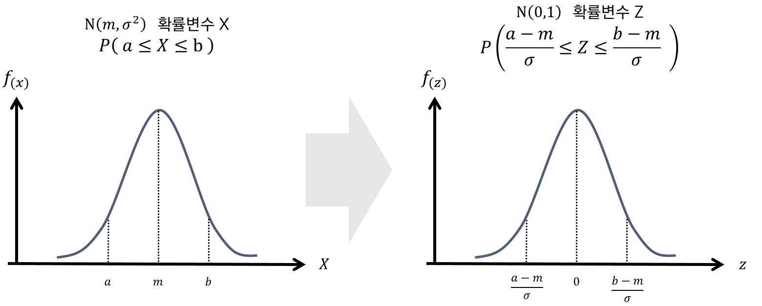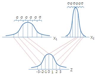 : 서로 다른 정규분포를 비교할 수 있도록 여러 개의 분포를 어떤 하나의 기준으로 재배치해서 서로 비교할 수 있도록 한 표준화된 분포