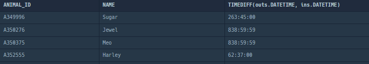 SELECT ins.ANIMAL_ID, ins.NAME, TIMEDIFF(outs.DATETIME, ins.DATETIME)