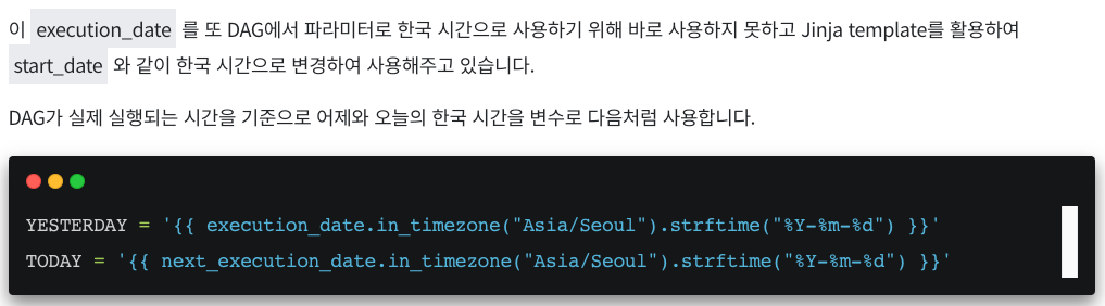 그러나, execution_date 가 의미가 있으려면, execution_date로 코드 상에서 조건을 걸어주어 해당 날짜 이후 데이터 혹은 이전의 데이터를 가져오는 식으로 사용한다.