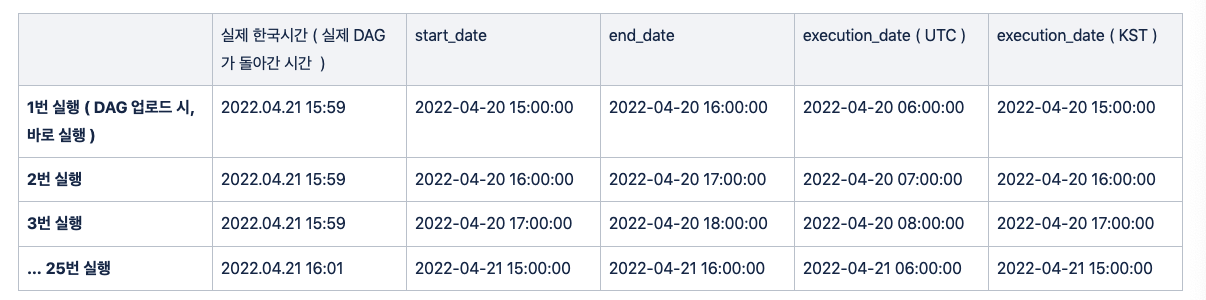 - execution_date : 스케쥴을 한시간에 한번이라면, DAG 실행 한시간 전에 대한 시간
