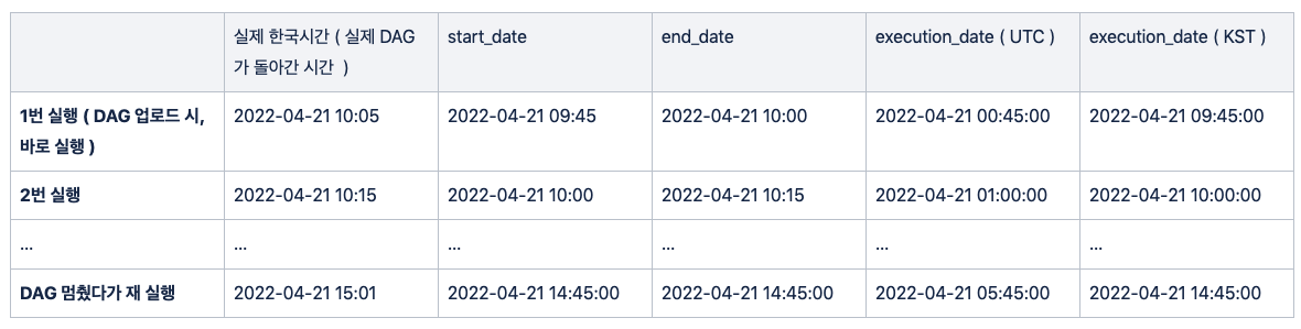 - 그런 의미에서, 추후에 backfill 을 하더라도, 즉 나중에 해당 dag를 다시 실행하더라도 execution_date는 그대로 유지 된다.