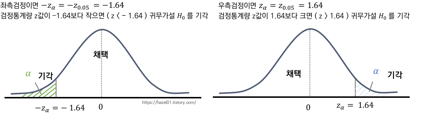 -z_0.05 = -1.64 , -z < - 1.64 보다 작다면 , H0 기각이됨. H1을 선택