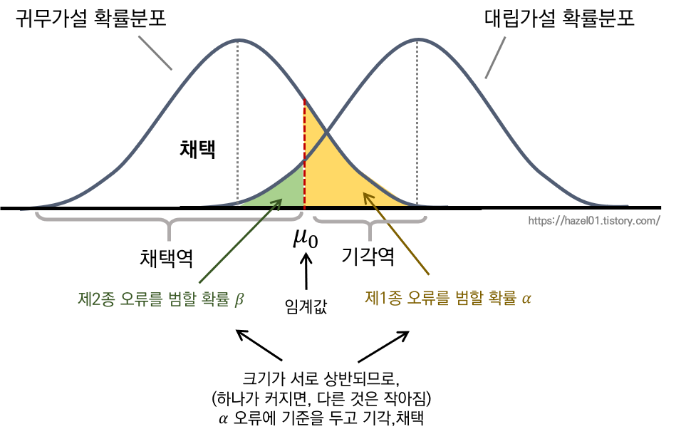 : 귀무가설이 맞을 때 , 귀무가설을 기각하는 오류 - 1종 오류를 조금 더 조심히 다룸.