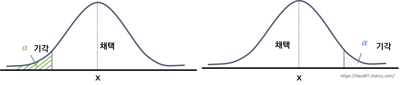 : 분포가 있을 때, 양측 검정을 할지, 단측 검정을 할지 어떤 가설을 선택할지 판단.