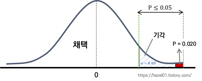 : 이 값이 유의 수준보다 낮으면 귀무가설을 기각. 즉, p 값 < α 이면, 기각