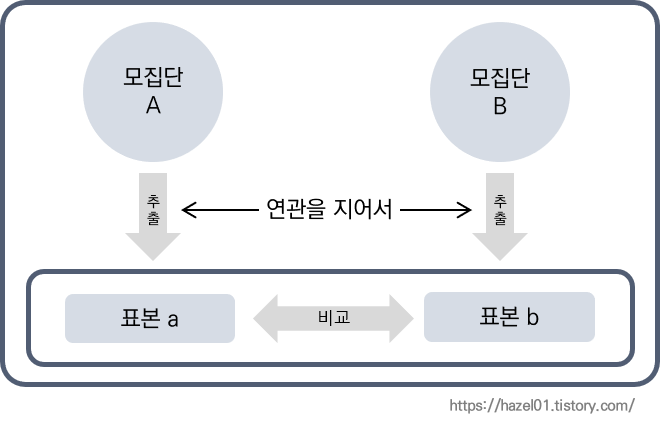 : 두 모집단으로부터 표본을 각각 추출하는데, 표본을 구성하는 인자가 짝을 지여서 연관되는 것을 의미