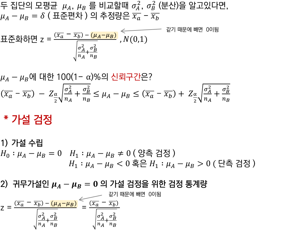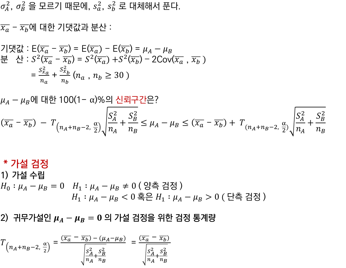 - 실제로는 한개의 집단을 비교하는게 아니라, 두 모집단 간을 추론하는 경우가 많이 생긴다.