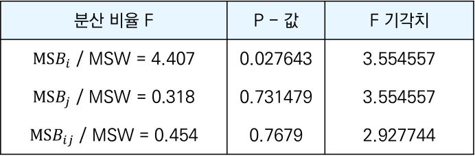 - F 분포표에서 F 기각치( F 값 )를 찾으면, 아래의 표와 같은 결과가 나온다.