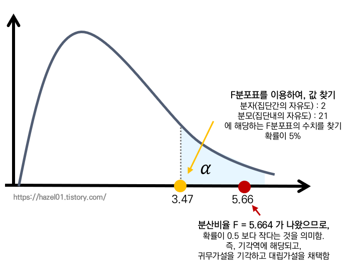 - 분산비율 F = 5.664 가 나왔으므로, 확률이 0.5 보다 작다는 것을 의미함.