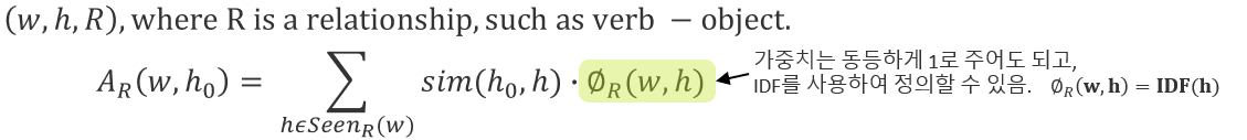 - 단점 : 유사도를 비교하기 위해서 Seen_r(W) 함수를 통헤 대상을 선정하기 때문에, 코퍼스에 따라 유사도를 구할 수 있는 대상이 달라짐. 그에 따라 커버리지 문제가 발생할 수 있음