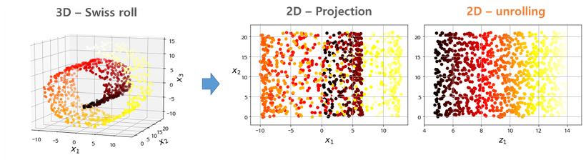: 만약, 직선의 데이터가 아니라면, 평평하게 펴주는 작업을 하던지, 커널등을 이용하여 비선형데이터도 잘 찾아주는 차원축소법을 사용해야한다. ( ex, kernel PCA , autoencoder )
