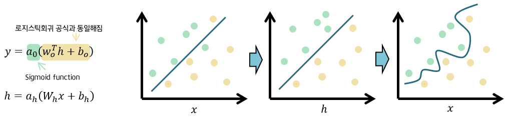 단지, 은닉 계층에서 데이터를 선형 회귀가 잘 되도록 변환이 있다는 점만 다르다!