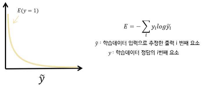 - 교차 엔트로피 오차 ( Cross entropy error ; CEE ) : 정확히 맞추면 오차가 0, 틀릴수록 오차가 무한히 증가한다.