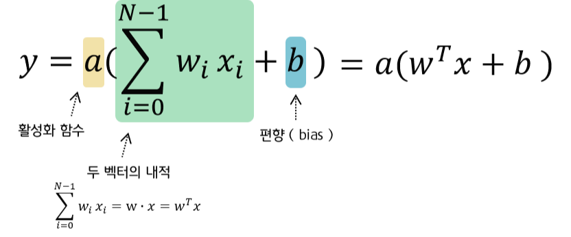 -> 입력이 들어오면, 각 입력에 가중치가 곱해지고 그것을 다 더한 후, 활성화 함수를 통과하는 과정을 거친다.