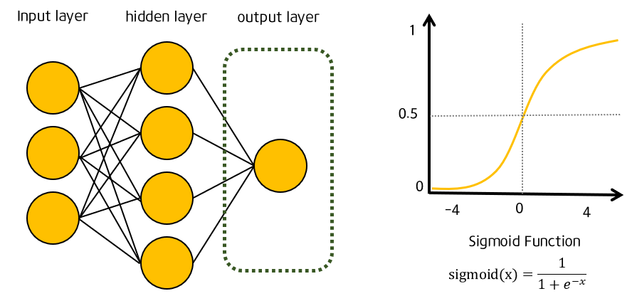 : 분류 모형 역시, hidden state에서 결정되는 것이 아니라, output layer에서 결정되는데, 출력 계층을 보면 회귀 모형이랑 좀 다른 것을 볼 수 있다. 바로, 출력 노드가 하나라는 점이다. 또한, 활성 함수도 sigmoid 를 사용한다.