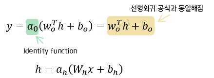 : 얕은 신경망에서 회귀를 구하는 것은, hidden state에서 결정되는 것이 아니라, output layer의 활성화 함수에 의해 결정되게 된다. 회귀는 전 범위의 연속된 값을 output으로 하기 때문에, identity function ( 항등 함수 )를 사용한다.