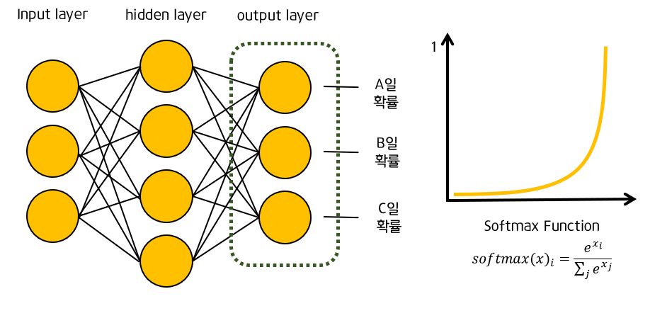 : 다중 클래스 분류에서는 output 의 값이 해당 class에 속할 확률로 나온다. 즉, a일때의 확률, b일때의 확률, c일때의 확률이다. 이러한 결과값을 가지기 위해서 활성함수로 softmax를 사용한다.