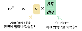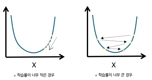 : 경사하강법이 이동하는데, 이 학습률 α에 비례(α를 곱해서) 하여 이동한다. 따라서, 적절한 학습률을 선택해야, 최적의 값을 구할 수 있다.