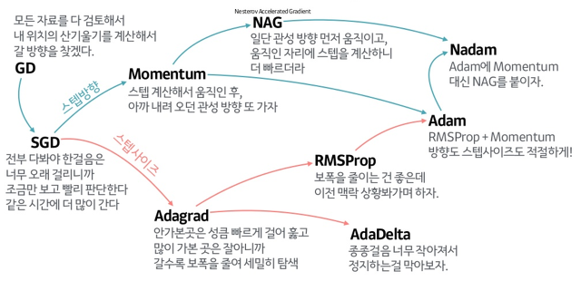 - 옵티마이저의 발전과정은 gradient 와 learning rate 를 어떻게 수정했냐에 따라서 달라진다.