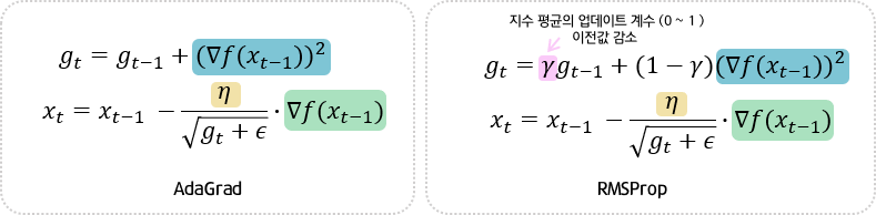 : AdaGrad의 문제점을 개선한 것으로, 합 대신 지수 평균을 이용하였다.