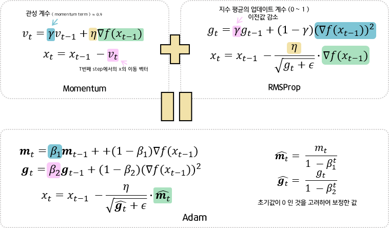 : RMSProp 와 Momentum의 장점을 결합한 알고리즘. 가장 최신의 기술이며 딥러닝에서 가장 많이 사용됨.