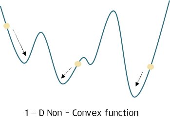 1. 대부분의 모델은 비볼록 함수이므로, 단순한 경사 하강법으로는 초기값에 따라 local minimum에 빠질 위험이 있다.