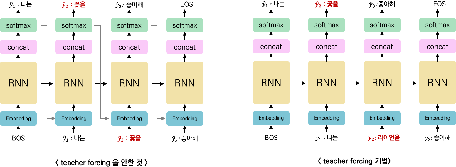 teacher forcing을 안하면, 잘못된 답 ( ex, 꽃을 ) 이 다음의 input 으로 들어간것을 볼 수 있다.