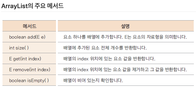 - 자바에서는 ArrayList 를 많이 활용함 ( 파이썬에서 array와 비슷한 것 같다 )