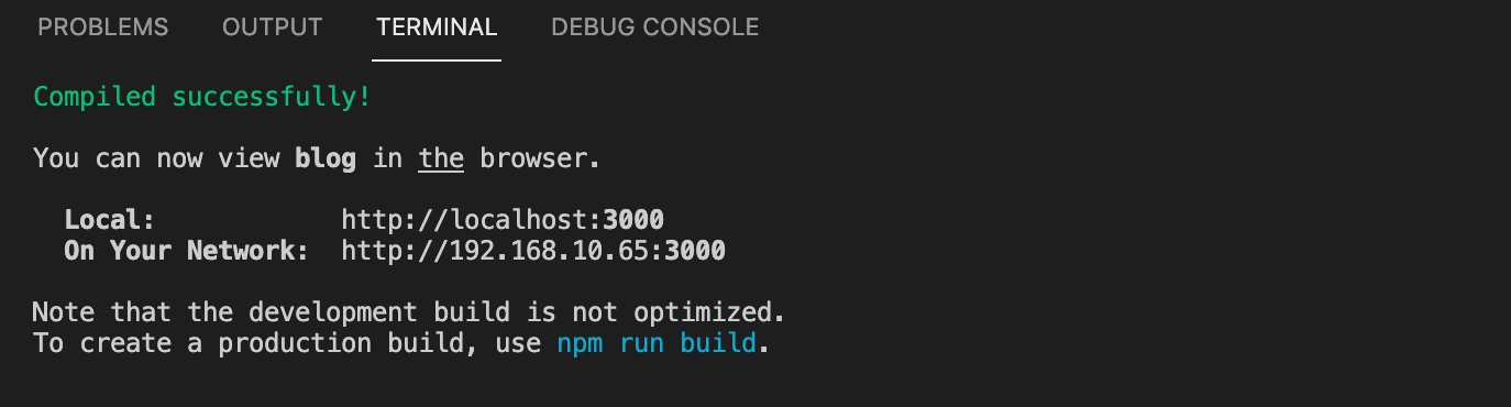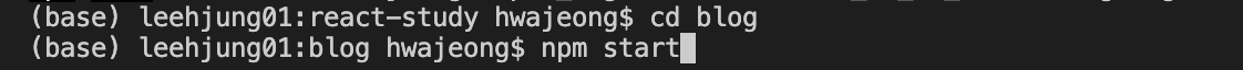 이때, cd blog 로 blog ( 혹은 위에서 자신이 만든 폴더 ) 로 이동을 해준 다음에 npm start를 입력해주어야합니다.